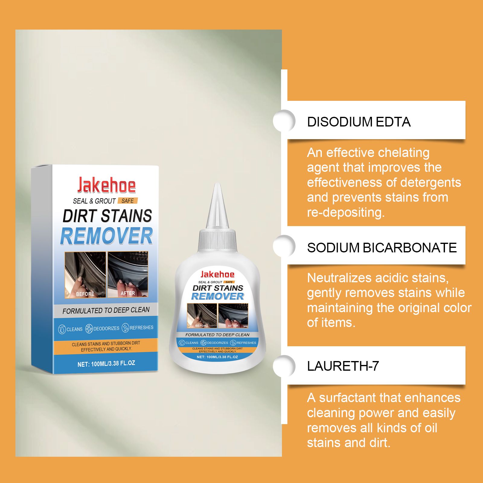 Description: Jakehoe Dirt Stains Remover is a powerful gel-based cleaner formulated with Sodium Hypochlorite, Carbomer, and Triethanolamine. It is specifically designed to effectively remove stubborn stains like grease, dirt, and dust from various surfaces. The gel penetrates deeply into stains and dissolves them, making cleaning effortless. How to Use: Keep the surface dry. Apply the cleaner evenly onto the stained area. Once the stain dissolves, wipe off the residue with a clean cloth. This product is perfect for cleaning a variety of surfaces and restoring their shine, saving you time and effort. This multi-purpose cleaner can be used to remove tough stains and dirt from surfaces such as kitchen counters, floors, tiles, and more, leaving surfaces clean and sparkling. | |