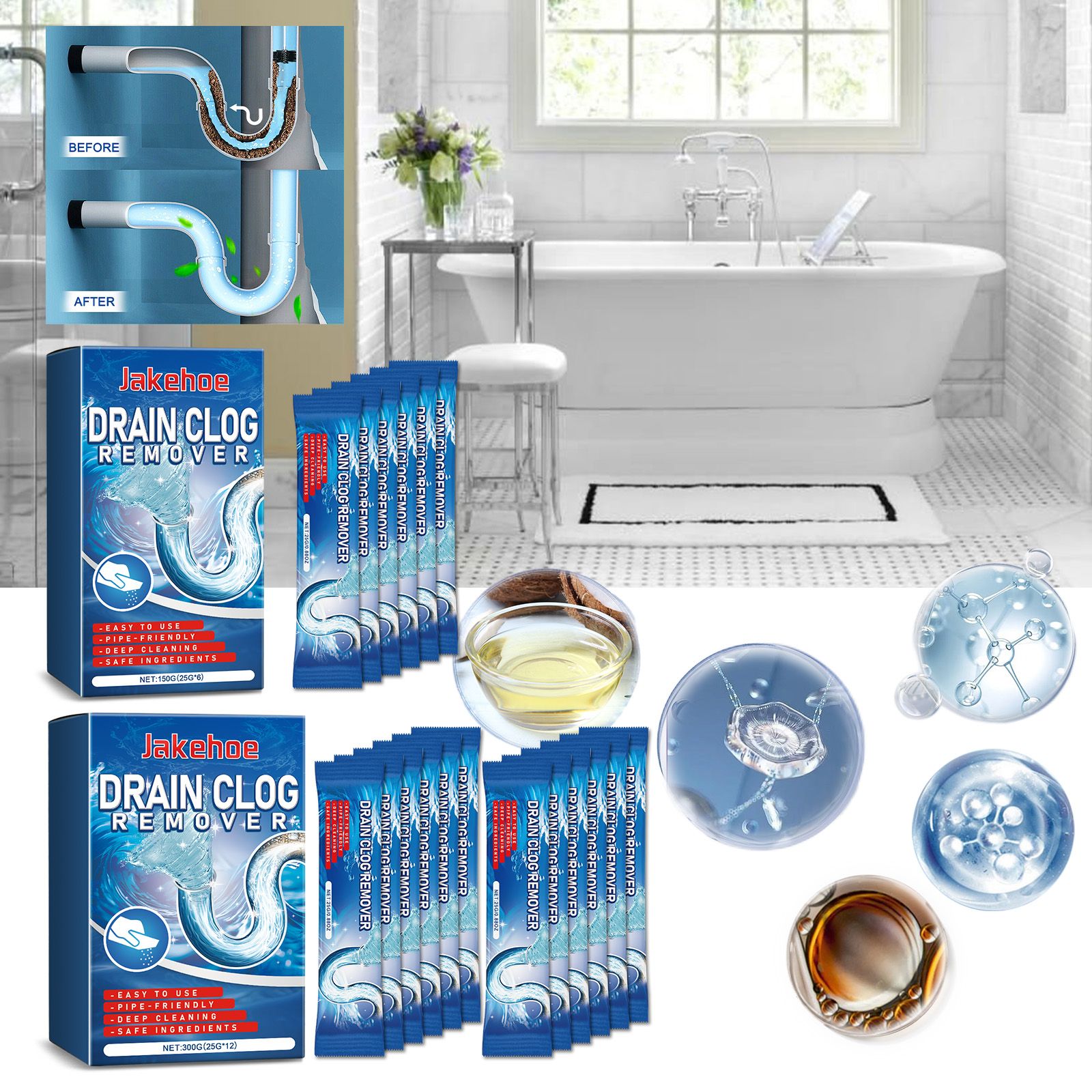 Description: Jakehoe Drain Clog Remover is an effective powder formula designed to clear the most stubborn drain clogs. Containing ingredients like Cocamidopropyl Betaine, EDTA Disodium, and Sodium Bicarbonate, it works to dissolve hair, grease, and other difficult substances blocking your pipes, restoring your drainage system to optimal performance. How to Use: For clogged sinks, first drain any standing water, then rinse the area with laundry detergent and water. Next, pour the detergent into the clogged drain. Wait for 10 minutes to allow the debris to dissolve, and finally rinse with clean water. This powerful drain cleaner helps clear out stubborn blockages and ensures a smooth-flowing drainage system. Key Benefits: It is fast-acting and effective for dissolving grease, hair, and soap scum from kitchen and bathroom pipes. Ideal for home use and maintenance, this product can be used regularly to prevent future blockages and ensure proper drainage. | |